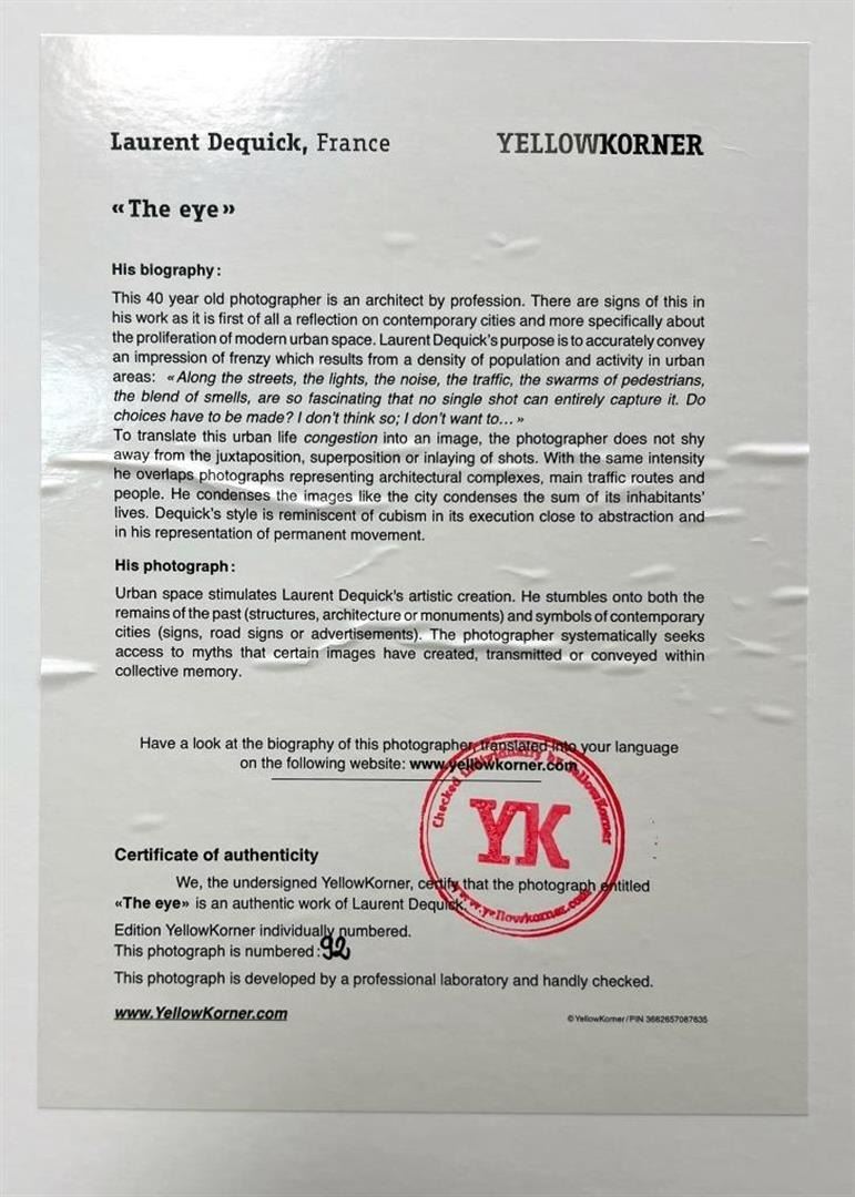 Laurent Dequick France The Eye YellowKorner Certified Photograph. Certificate of Authenticity from YellowKorner affixed to the back. Matted Dimensions 16"x20". Protected with Clear Mylar Sleeve.