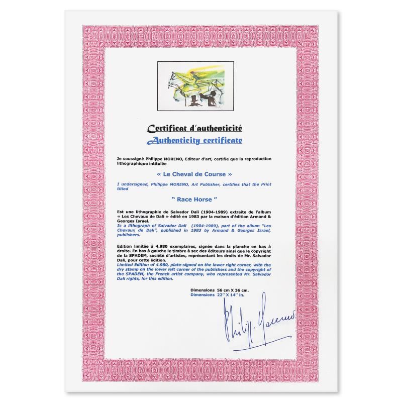 "Le Cheval de Course (Race Horse)" is a limited edition lithograph by Salvador Dali (1904-1989), bearing the plate signature of the artist. This piece was published by Armand & Georges Israel in 1983 during Dali's lifetime and under his supervision. This piece was printed on Velin D'arches paper in Paris. This work is referenced in The Official Catalog of the Graphic Works of Salvador Dali (Albert Fields). This piece comes custom framed. Includes Certificate of Authenticity. Measures approx. 28" x 20" (frame), 22" x 14" (image). This item requires special handling and may have a longer than usual turnaround.