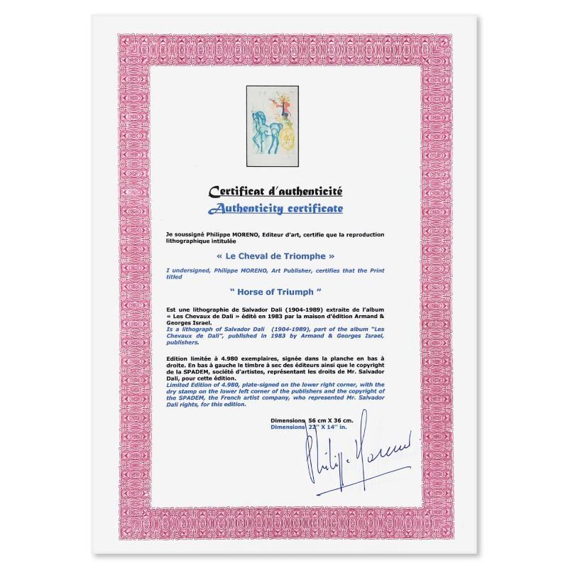 "Le Cheval de Triomphe (Horse of Triumph)" is a limited edition lithograph by Salvador Dali (1904-1989), bearing the plate signature of the artist. This piece was published by Armand & Georges Israel in 1983 during Dali's lifetime and under his supervision. This piece was printed on Velin D'arches paper in Paris. This work is referenced in The Official Catalog of the Graphic Works of Salvador Dali (Albert Fields). This piece comes custom framed. Includes Certificate of Authenticity. Measures approx. 20" x 28" (frame), 14" x 22" (image). This item requires special handling and may have a longer than usual turnaround.