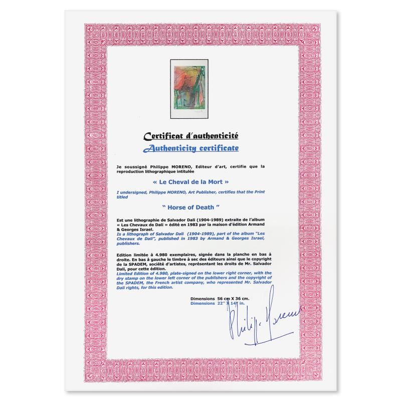 "Le Cheval de la Mort (Horse of Death)" is a limited edition lithograph by Salvador Dali (1904-1989), bearing the plate signature of the artist. This piece was published by Armand & Georges Israel in 1983 during Dali's lifetime and under his supervision. This piece was printed on Velin D'arches paper in Paris. This work is referenced in The Official Catalog of the Graphic Works of Salvador Dali (Albert Fields). This piece comes custom framed. Includes Certificate of Authenticity. Measures approx. 20" x 28" (frame), 14" x 22" (image).