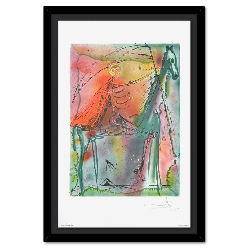"Le Cheval de la Mort (Horse of Death)" is a limited edition lithograph by Salvador Dali (1904-1989), bearing the plate signature of the artist. This piece was published by Armand & Georges Israel in 1983 during Dali's lifetime and under his supervision. This piece was printed on Velin D'arches paper in Paris. This work is referenced in The Official Catalog of the Graphic Works of Salvador Dali (Albert Fields). This piece comes custom framed. Includes Certificate of Authenticity. Measures approx. 20" x 28" (frame), 14" x 22" (image).