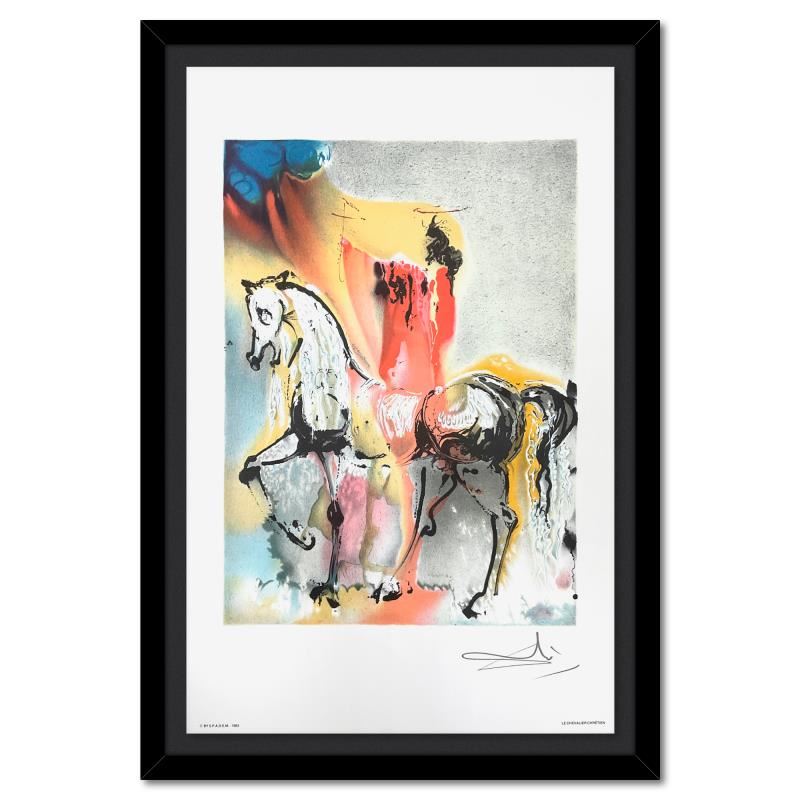 "Le Chevalier Chretien (The Christian Knight)" is a limited edition lithograph by Salvador Dali (1904-1989), bearing the plate signature of the artist. This piece was published by Armand & Georges Israel in 1983 during Dali's lifetime and under his supervision. This piece was printed on Velin D'arches paper in Paris. This work is referenced in The Official Catalog of the Graphic Works of Salvador Dali (Albert Fields). This piece comes custom framed. Includes Certificate of Authenticity. Measures approx. 28" x 20" (frame), 22" x 14" (image).