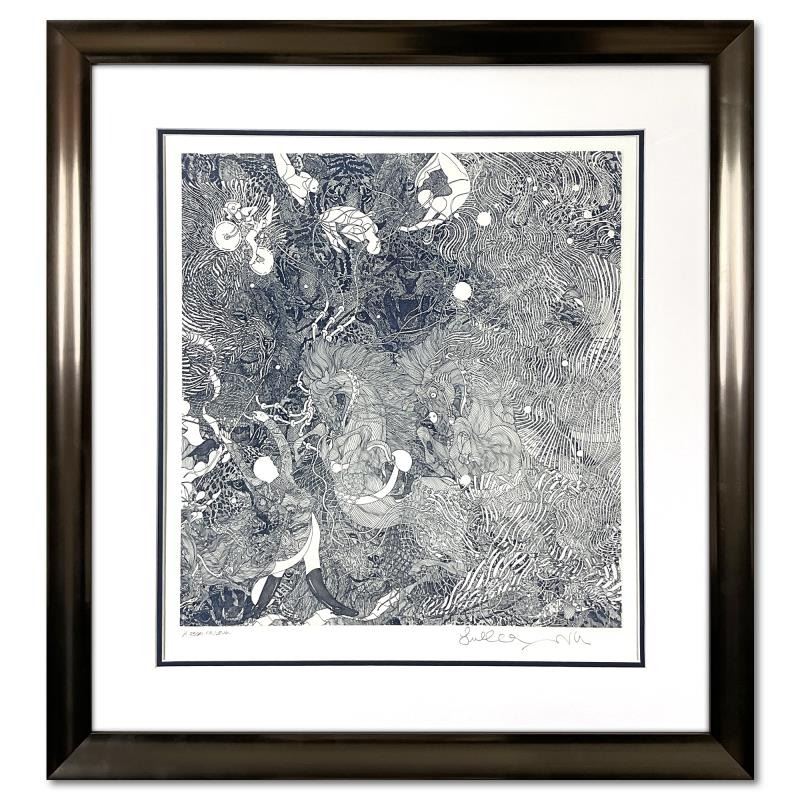 "Le Circue (Blue)" is a limited edition etching on paper by Guillaume Azoulay, numbered 1/1 and hand signed by the artist. This piece comes custom framed. Includes Letter of Authenticity. Measures approx. 28" x 29.5" (frame), 17.5" x 19" (image).