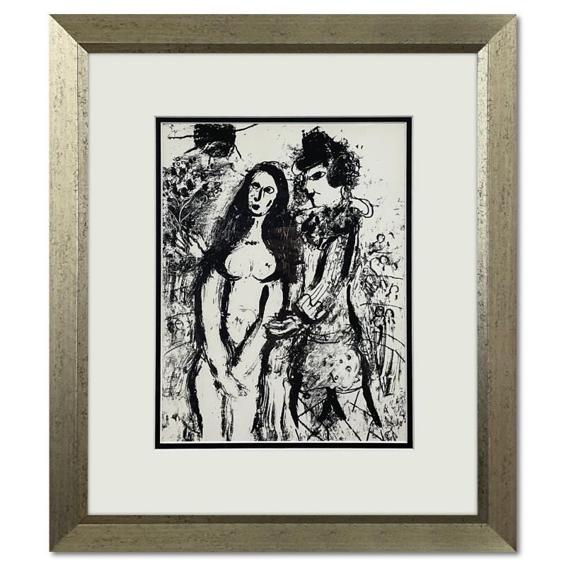 "Le Clown Amoureux" is a lithograph on paper by Marc Chagall (1887-1985). This piece comes custom framed. Includes Letter of Authenticity. Measures approx. 18" x 21" (frame), 9.5" x 12" (image).