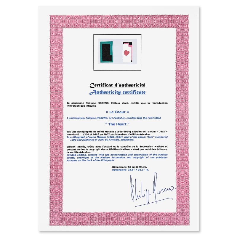 "Le Coeur (The Heart)" is a limited edition lithograph by Henri Matisse (1869-1954). This piece comes from an edition of 200 authorized by the Matisse Estate; the edition number is not on the piece itself but on the certificate. This piece comes custom framed. Includes Certificate of Authenticity. Measures approx. 37" x 29" (frame), 31" x 23" (image).