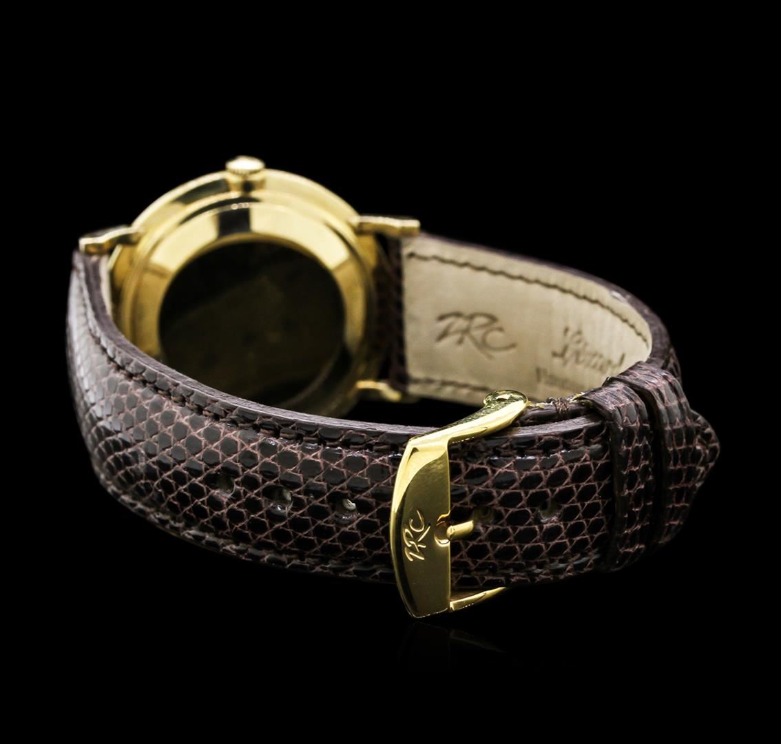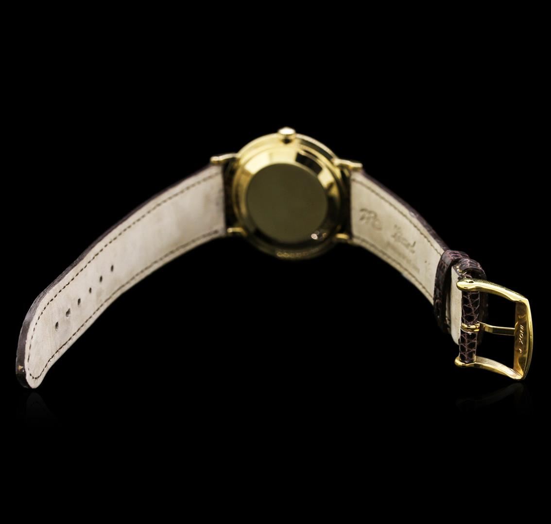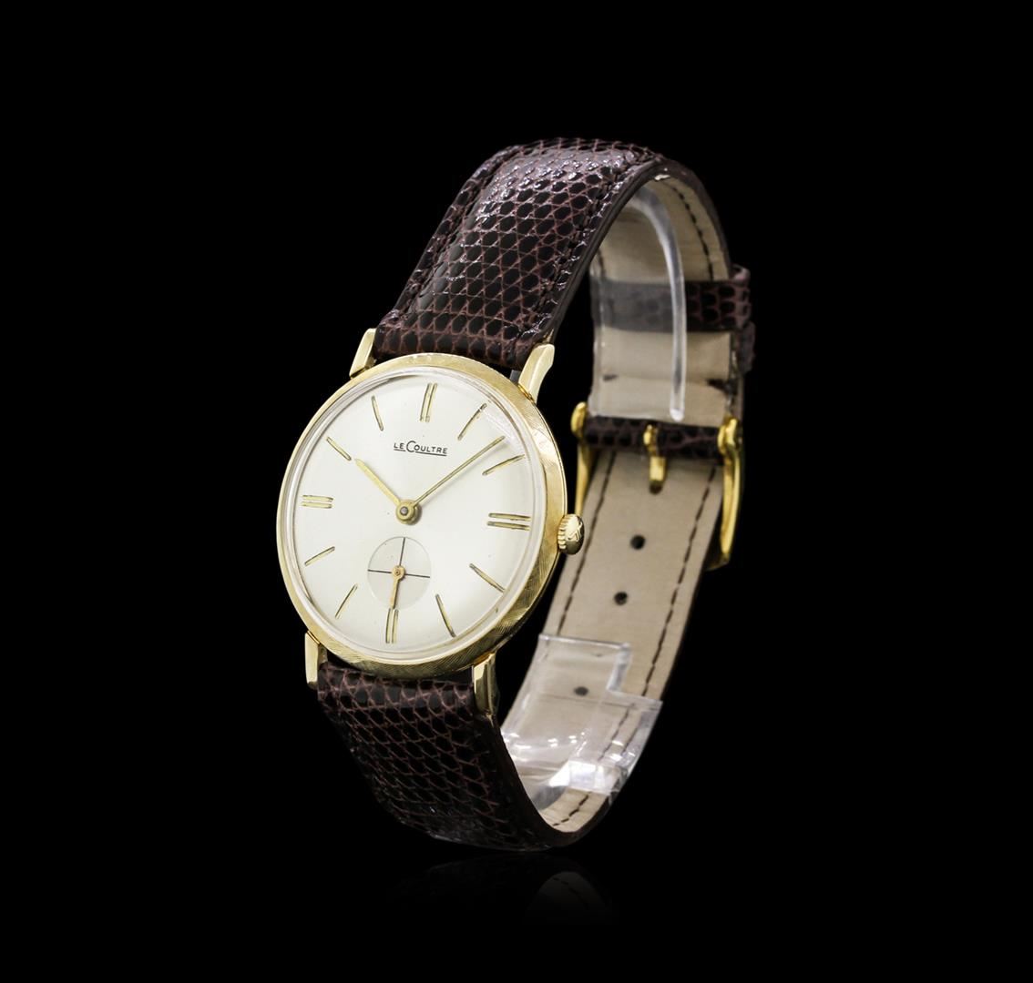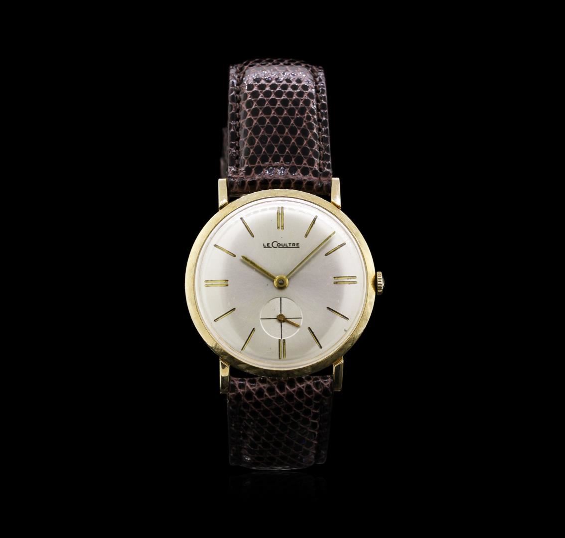 Le Coultre 14KT Yellow Gold Men's Vintage Watch. Lizard skin band; Mechanical hand-winding movement.