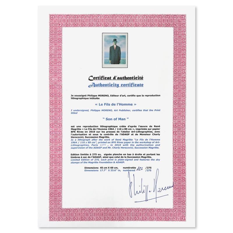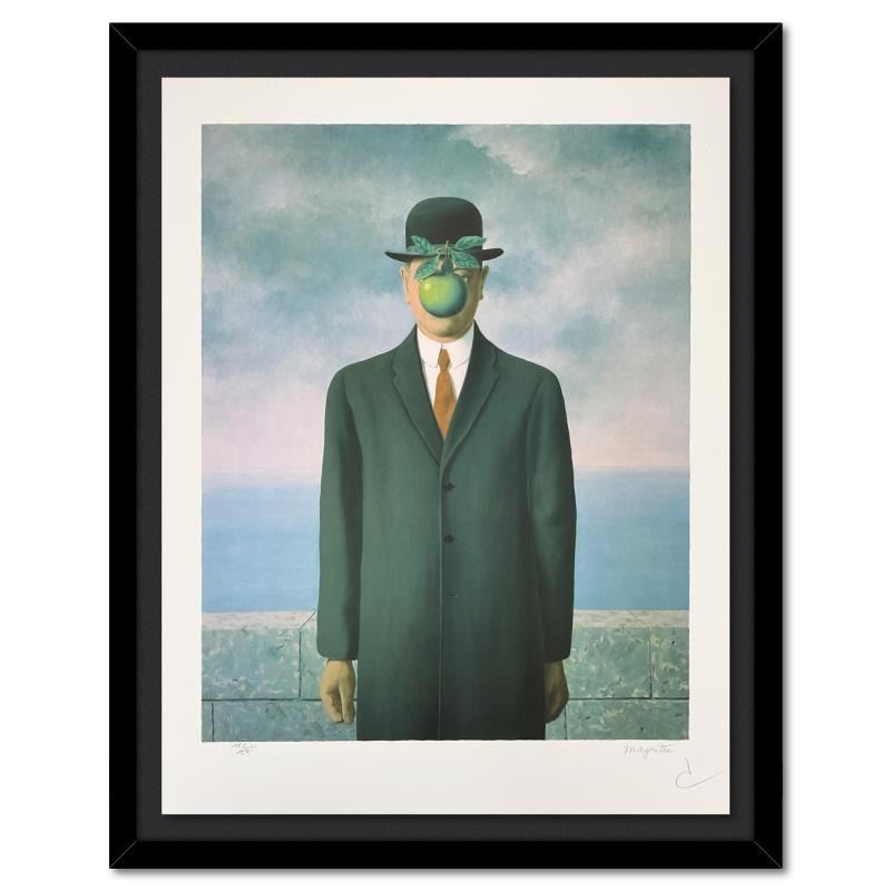 "Le Fils de l'Homme (The Son of Man)" is a limited edition lithograph by Rene Magritte (1898-1967). This piece is numbered 122/275 and bears the dry stamps of the Magritte Foundation & ADAGP (Society of Authors in the Graphic and Plastic Arts) and is sign