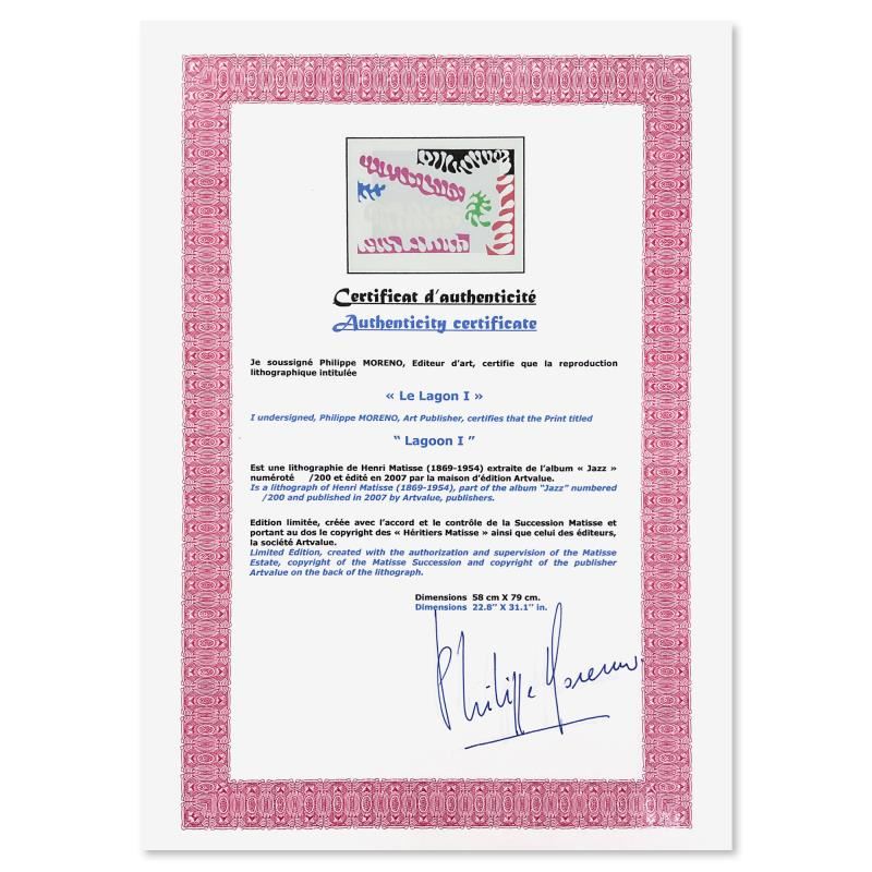 "Le Lagon I (Lagoon I)" is a limited edition lithograph by Henri Matisse (1869-1954). This piece comes from an edition of 200 authorized by the Matisse Estate; the edition number is not on the piece itself but on the certificate. This piece comes custom framed. Includes Certificate of Authenticity. Measures approx. 37" x 29" (frame), 31" x 23" (image).