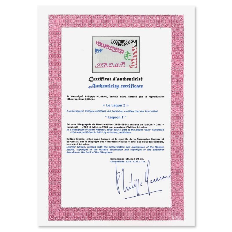 "Le Lagon I (Lagoon I)" is a limited edition lithograph by Henri Matisse (1869-1954). This piece comes from an edition of 200 authorized by the Matisse Estate; the edition number is not on the piece itself but on the certificate. This piece comes custom framed. Includes Certificate of Authenticity. Measures approx. 37" x 29" (frame), 31" x 23" (image). This item requires special handling and may have a longer than usual turnaround.