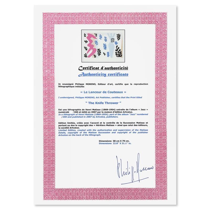 "Le Lanceur de Couteaux (The Knife Thrower)" is a limited edition lithograph by Henri Matisse (1869-1954). This piece comes from an edition of 200 authorized by the Matisse Estate; the edition number is not on the piece itself but on the certificate. This piece comes custom framed. Includes Certificate of Authenticity. Measures approx. 37" x 29" (frame), 31" x 23" (image).