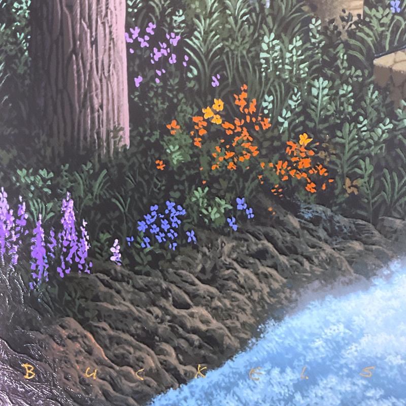 "Le Moulin" is a limited edition printer's proof serigraph on clayboard by Jim Buckels, numbered 1/1 and hand signed by the artist. Includes Letter of Authenticity. Measures approx. 23" x 34" (image).