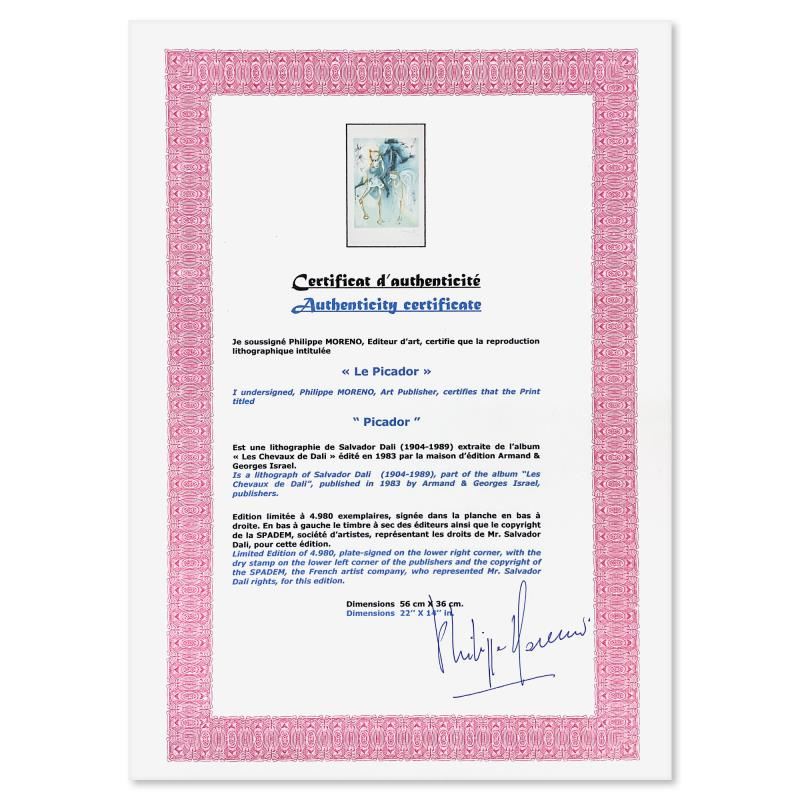 "Le Picador" is a limited edition lithograph by Salvador Dali (1904-1989) bearing the plate signature of the artist. This piece was published by Armand & Georges Israel in 1983 during Dalis lifetime and under his supervision. This piece was printed on Velin Darches paper in Paris. This work is referenced in The Official Catalog of the Graphic Works of Salvador Dali (Albert Fields). This piece comes custom framed. Includes Certificate of Authenticity. Measures approx. 20" x 28" (frame) 14" x 22" (image).