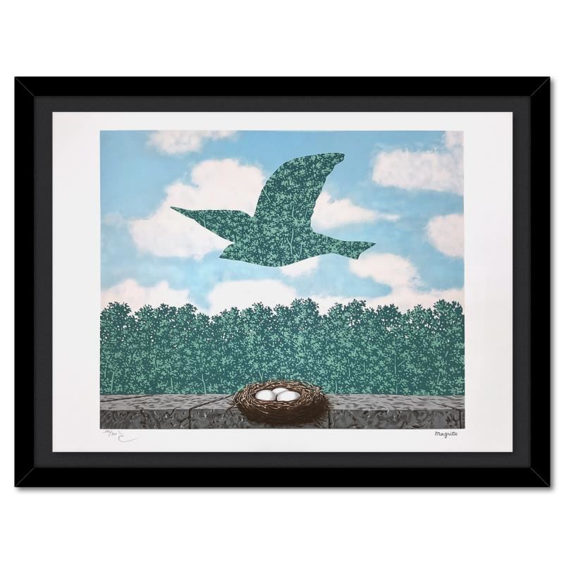 "Le Printemps (Spring)" is a limited edition lithograph by Rene Magritte (1898-1967). This piece is numbered 124/300 and bears the dry stamps of the Magritte Foundation & ADAGP (Society of Authors in the Graphic and Plastic Arts) and is signed by the President of the Magritte Foundation, Charly Herscovici. This piece comes custom framed. Includes Certificate of Authenticity. Measures approx. 36.5" x 29" (frame), 30.5" x 23" (image).