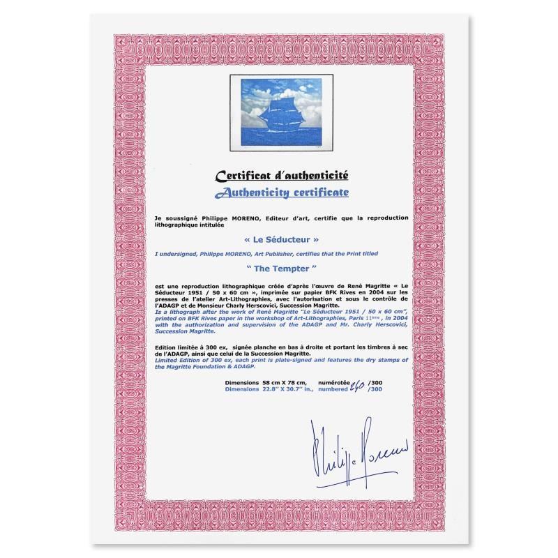 "Le Seducteur (The Tempter)" is a limited edition lithograph by Rene Magritte (1898-1967). This piece is numbered 240/300 and bears the dry stamps of the Magritte Foundation & ADAGP (Society of Authors in the Graphic and Plastic Arts) and is signed by the President of the Magritte Foundation, Charly Herscovici. This piece comes custom framed. Includes Certificate of Authenticity. Measures approx. 36.5" x 29" (frame), 30.5" x 23" (image).