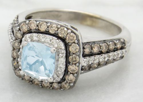 One tested 14K white gold designer Le Vian diamond and aquamarine ring. Containing: One 6MM X 6MM Aquamarine. Approximate Size: 1.00CT. 40 Chocolate and 38 white Round Brilliant Cut Diamonds. Approximate total diamond weight: .73CTW. All diamonds are graded in the mounting unless otherwise stated. Weight of ring: 6.3 grams, Size: 6.5.