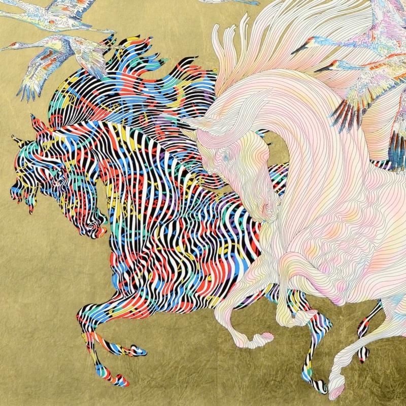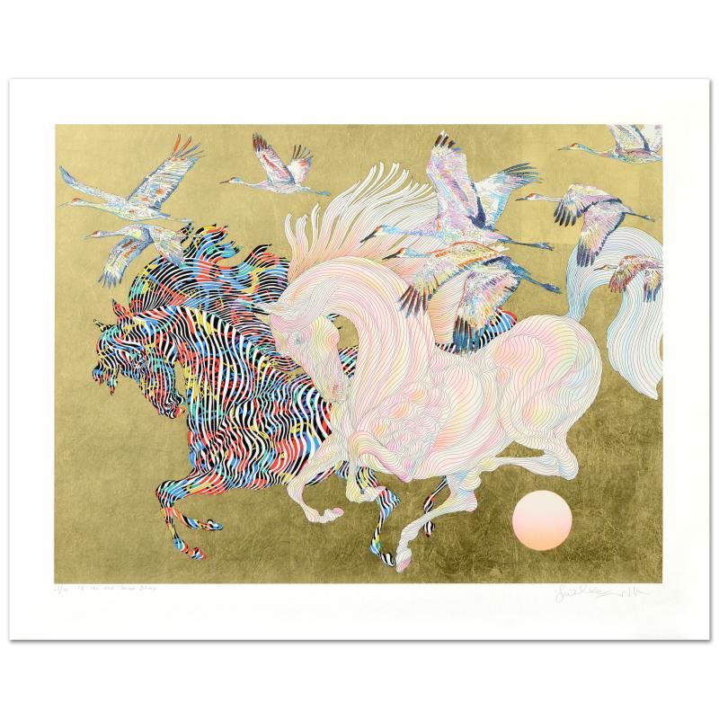 "Le Vol Des Grues" is a limited edition serigraph with hand laid gold leaf on artist paper by Guillaume Azoulay, numbered and hand signed by the artist! Includes Certificate of Authenticity! Measures approx. 37" x 29.5" (with border); 32" x 24" (image).