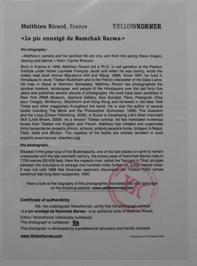 Le pic enneige de Namchak Barwa Certified Photograph, Matthieu Richard YellowKorner Certified Photograph. Certificate of Authenticity from YellowKorner affixed to the back. Matted Dimensions 16"x20". Protected with Clear Mylar Sleeve.