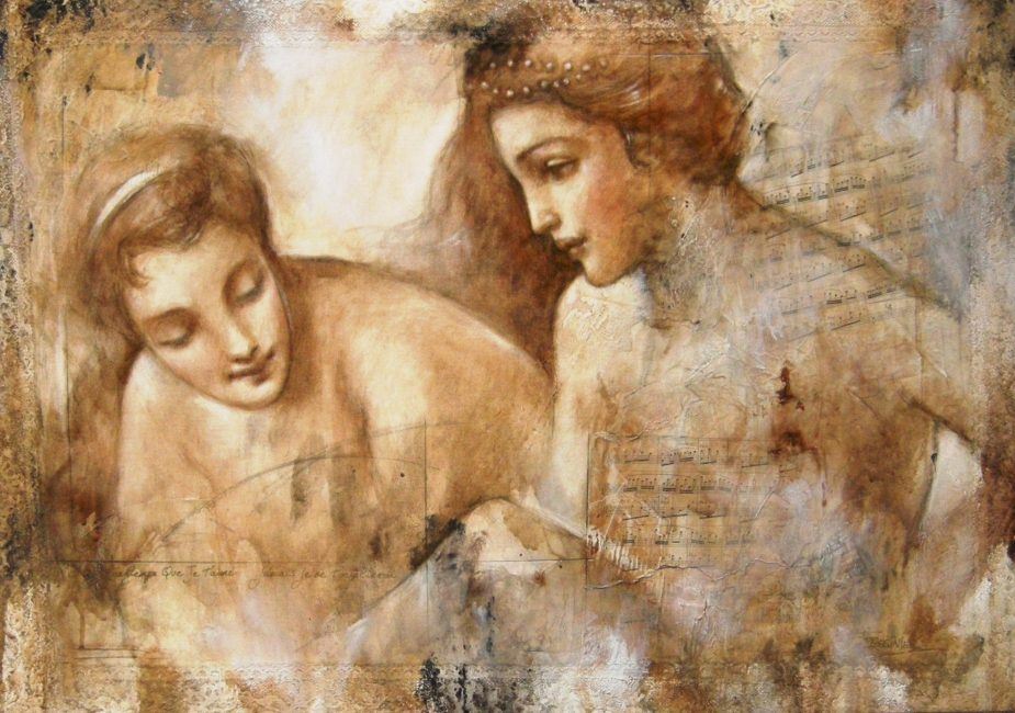 Muses by F. Fressinier shows two women and in the background of the painting is sheet music.This piece is a framed orginal oil on canvas with the size of 38" x 50".