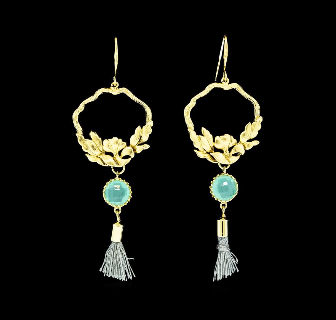 High end designer jewelry. Leaf Circle Tassel Drop Earrings - Gold Plated. Gold Plated Metal. Gold/ Turq. Post. Total Weight: 6.8 grams.