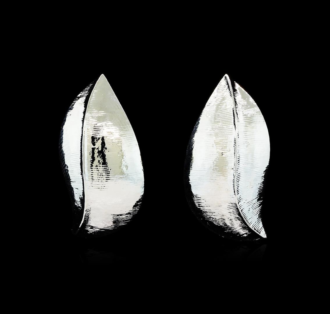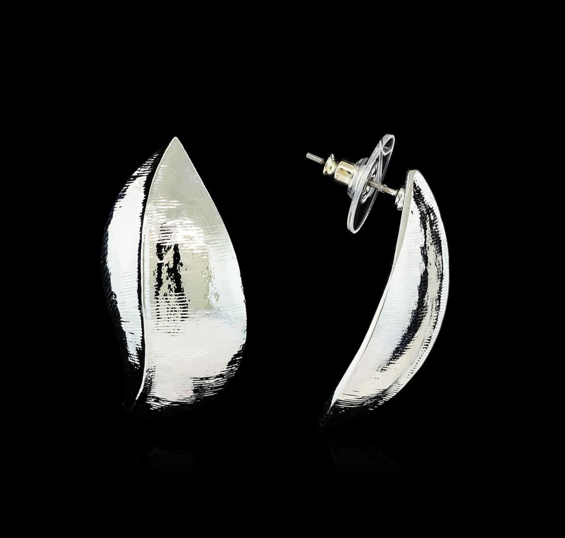 High end designer jewelry. Leaf Shaped Brushed Stud Earrings - Rhodium Plated. Rhodium Plated. Silver. 1.5inches.