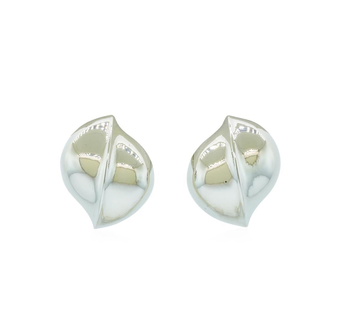 High end designer jewelry. Leaf Shaped Stud Earrings - Rhodium Plated. Rhodium Plated Set. Silver. 1inches.