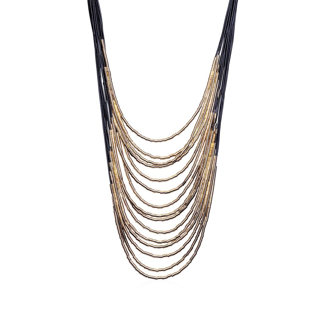 High end designer jewelry. Leather Cord Necklace - Gold Plated. Gold Plated Tubes/ Magnetic Clasp. Black/ Gold. 33inches.