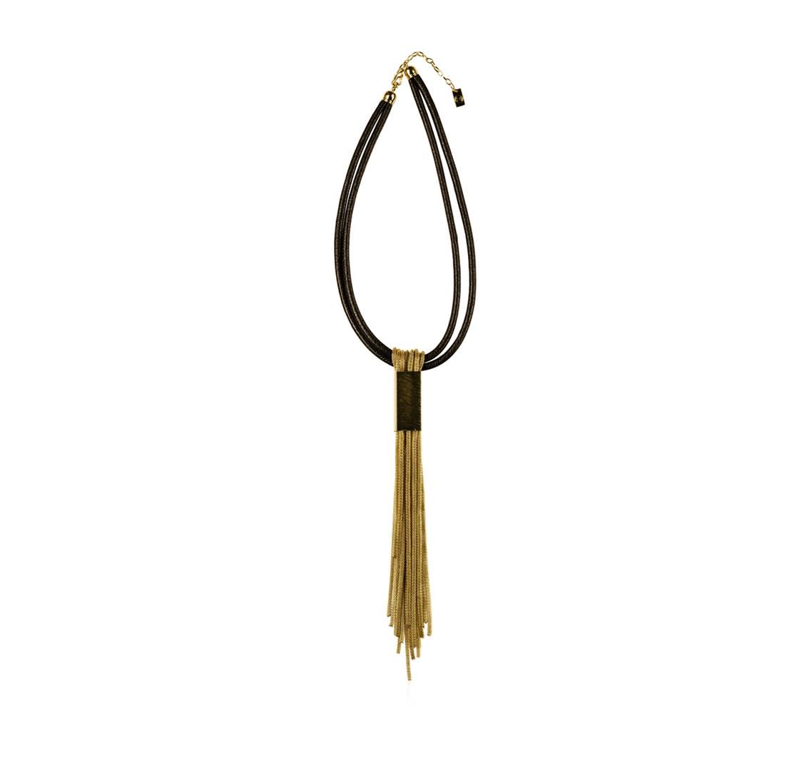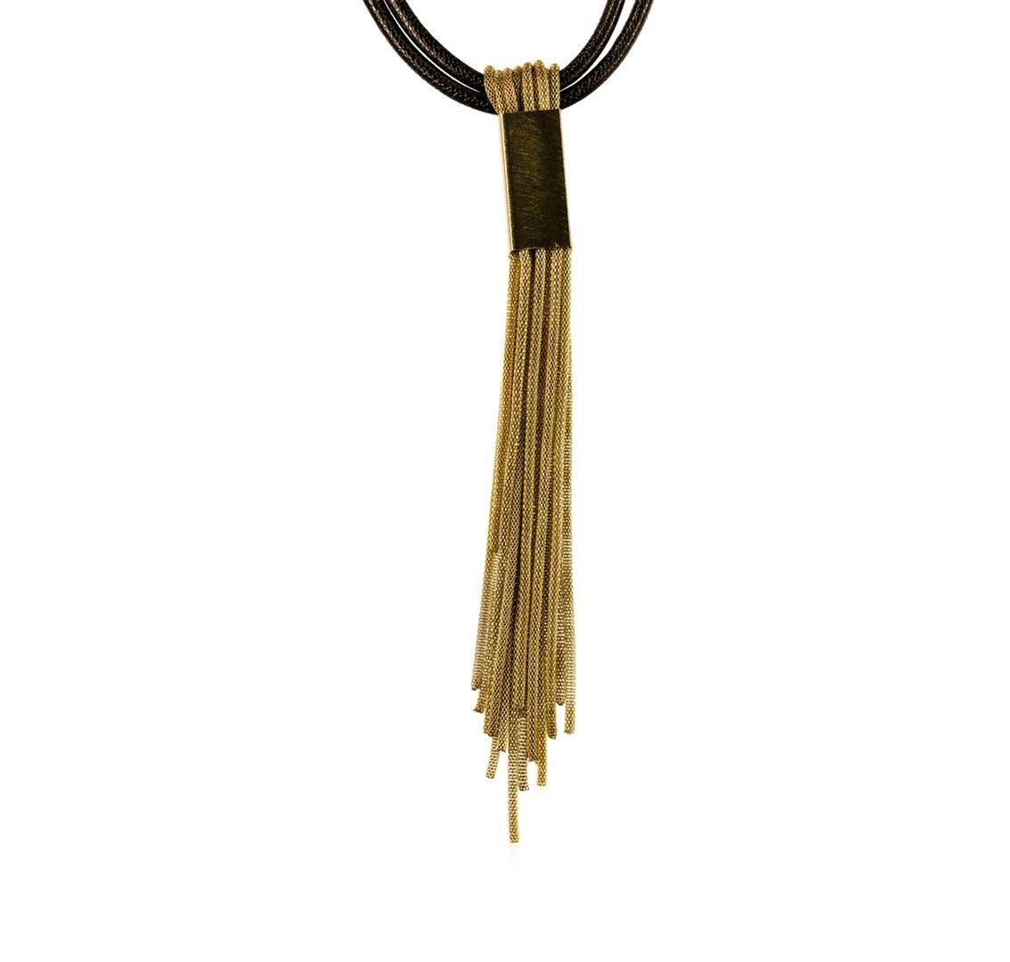 High end designer jewelry. Leather/Mesh Tassel Necklace - Gold Plated. Gold Plated Metal/3" Ext Clasp. Black/ Gold. 20/8inches.