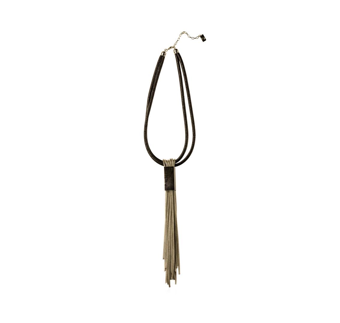 High end designer jewelry. Leather/Mesh Tassel Necklace - Rhodium Plated. Rhodium Plated Metal/3" Ext Clasp. Black/ Silver. 20/8inches.