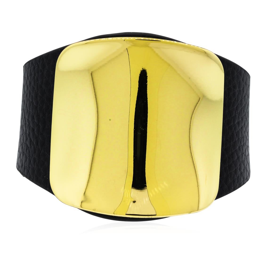 High end designer jewelry. Leather Strap Bracelet - Rhodium Plated. Gold Plated Metal. Black/ Gold. 7-8inches. Total Weight: 34.8 grams.