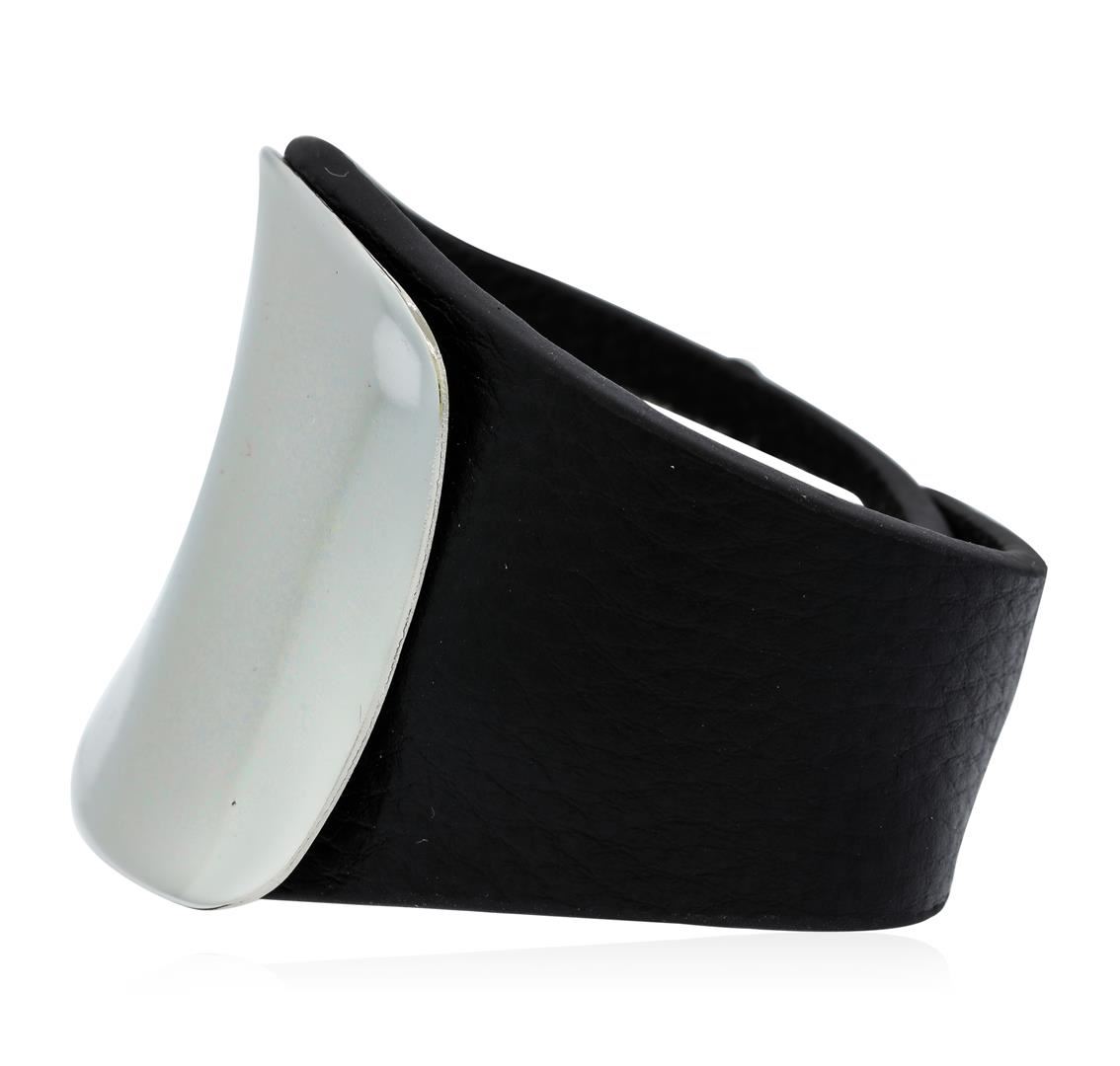 High end designer jewelry. Leather Strap Bracelet - Rhodium Plated. Rhodium Plated Metal. Black/ Silver. 7-8inches. Total Weight: 36.4 grams.