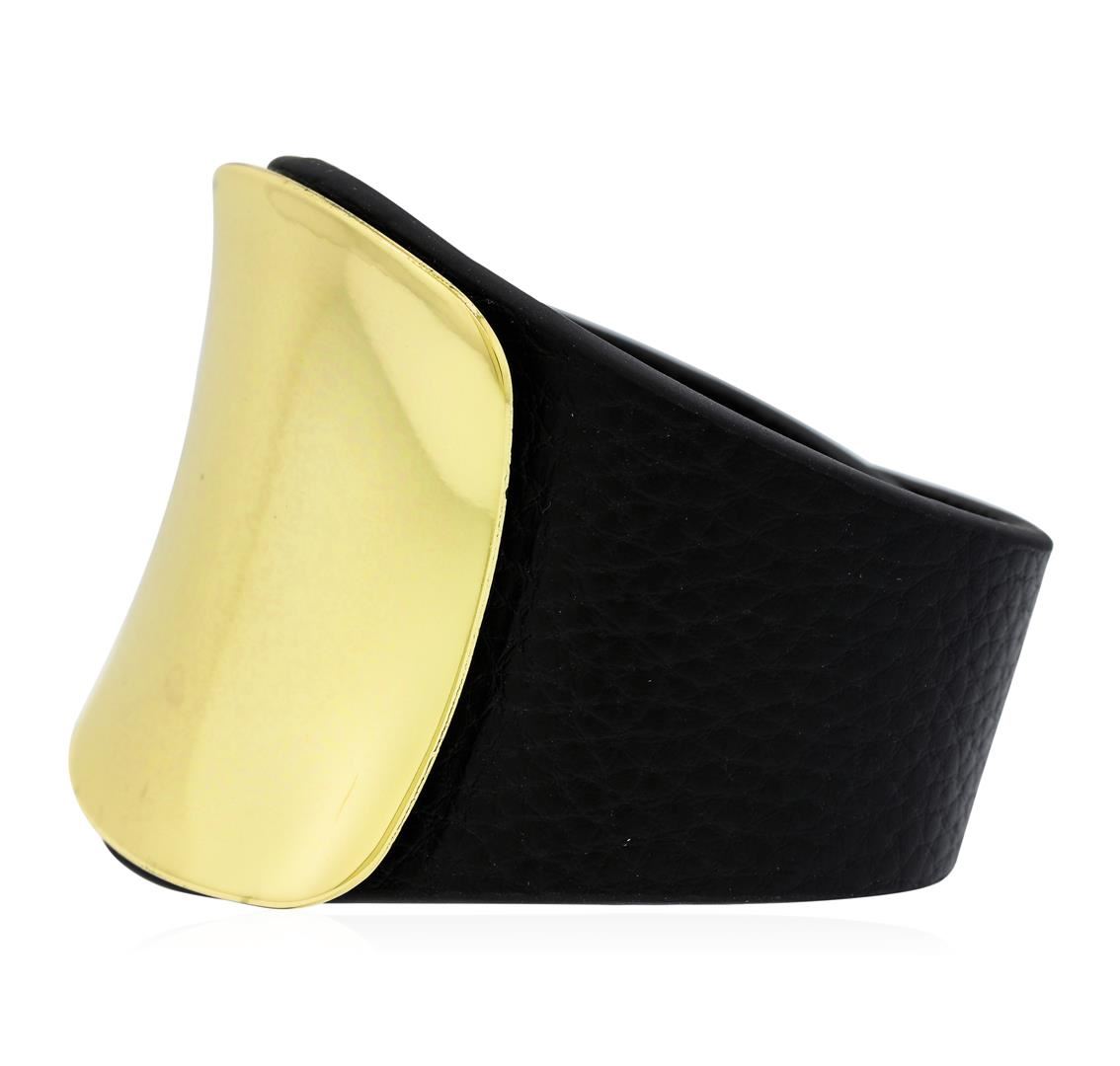 High end designer jewelry. Leather Strap Bracelet - Rhodium Plated. Gold Plated Metal. Black/ Gold. 7-8inches. Total Weight: 34.8 grams.