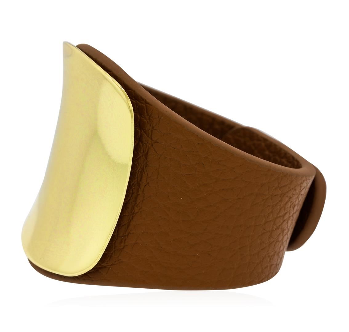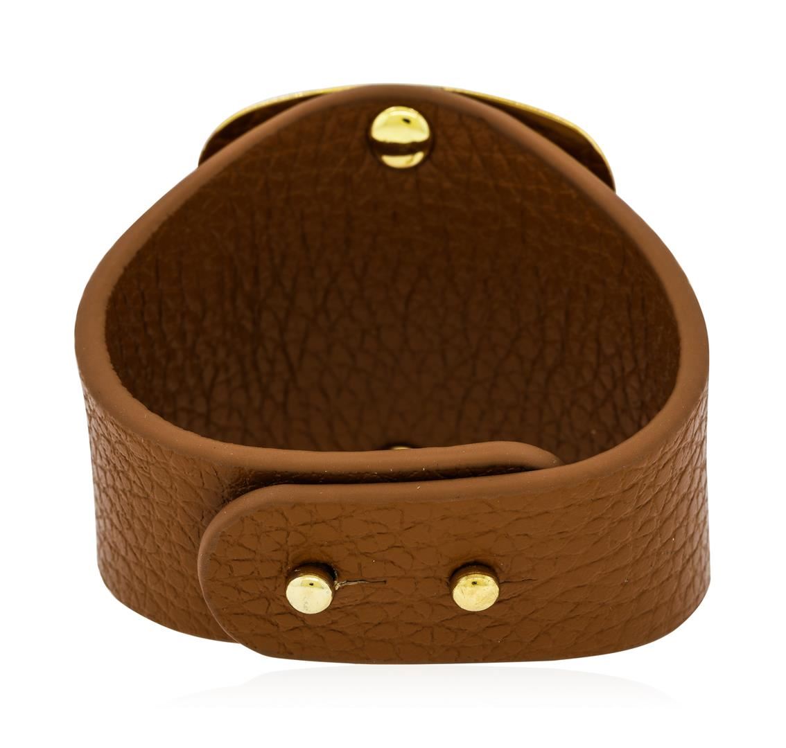 High end designer jewelry. Leather Strap Bracelet - Rhodium Plated. Gold Plated Metal. Gold/ Gold. 7-8inches.