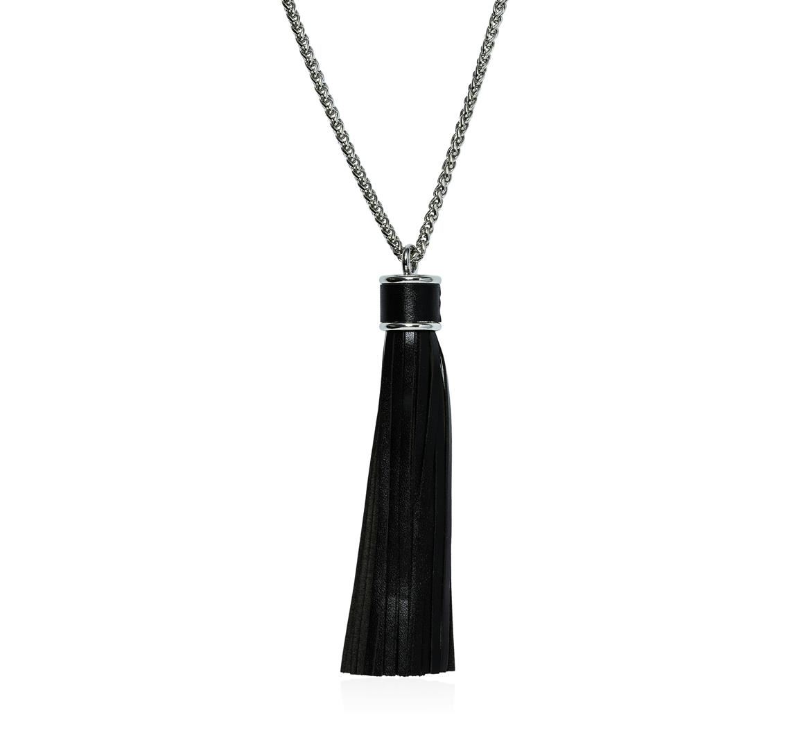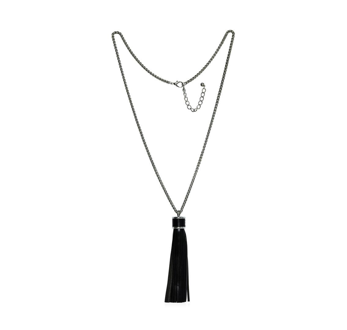 High end designer jewelry. Leather Tassel Chain Necklace - Gold Plated. Gold Plated Metal/3" Ext Clasp. Black/ Silver. 32/5inches. Total Weight: 66.5 grams.