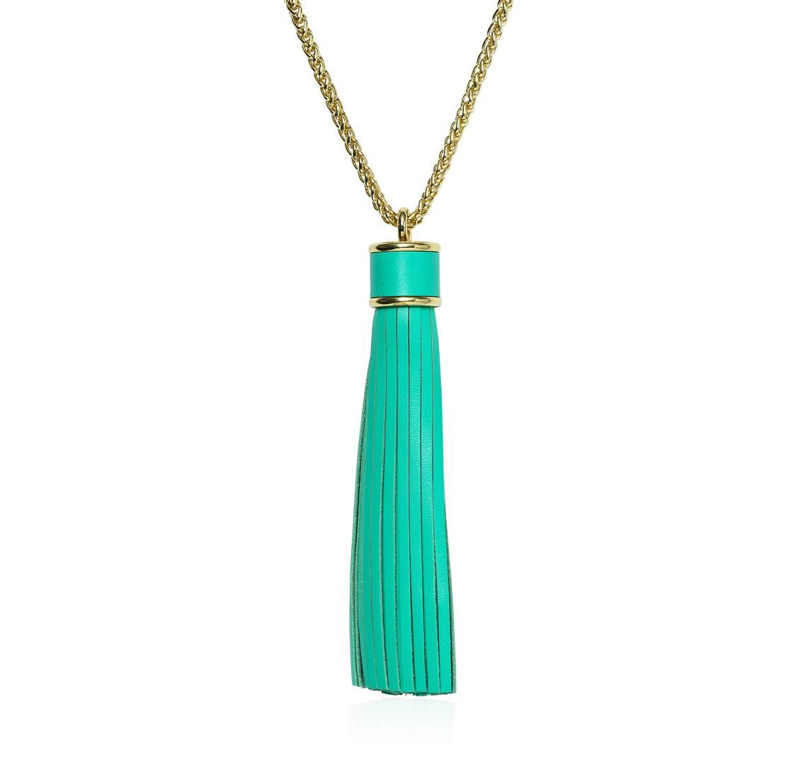 High end designer jewelry. Leather Tassel Chain Necklace - Gold Plated. Gold Plated Metal/3" Ext Clasp. Aqua/ Gold. 32/5inches. Total Weight: 64.6 grams.