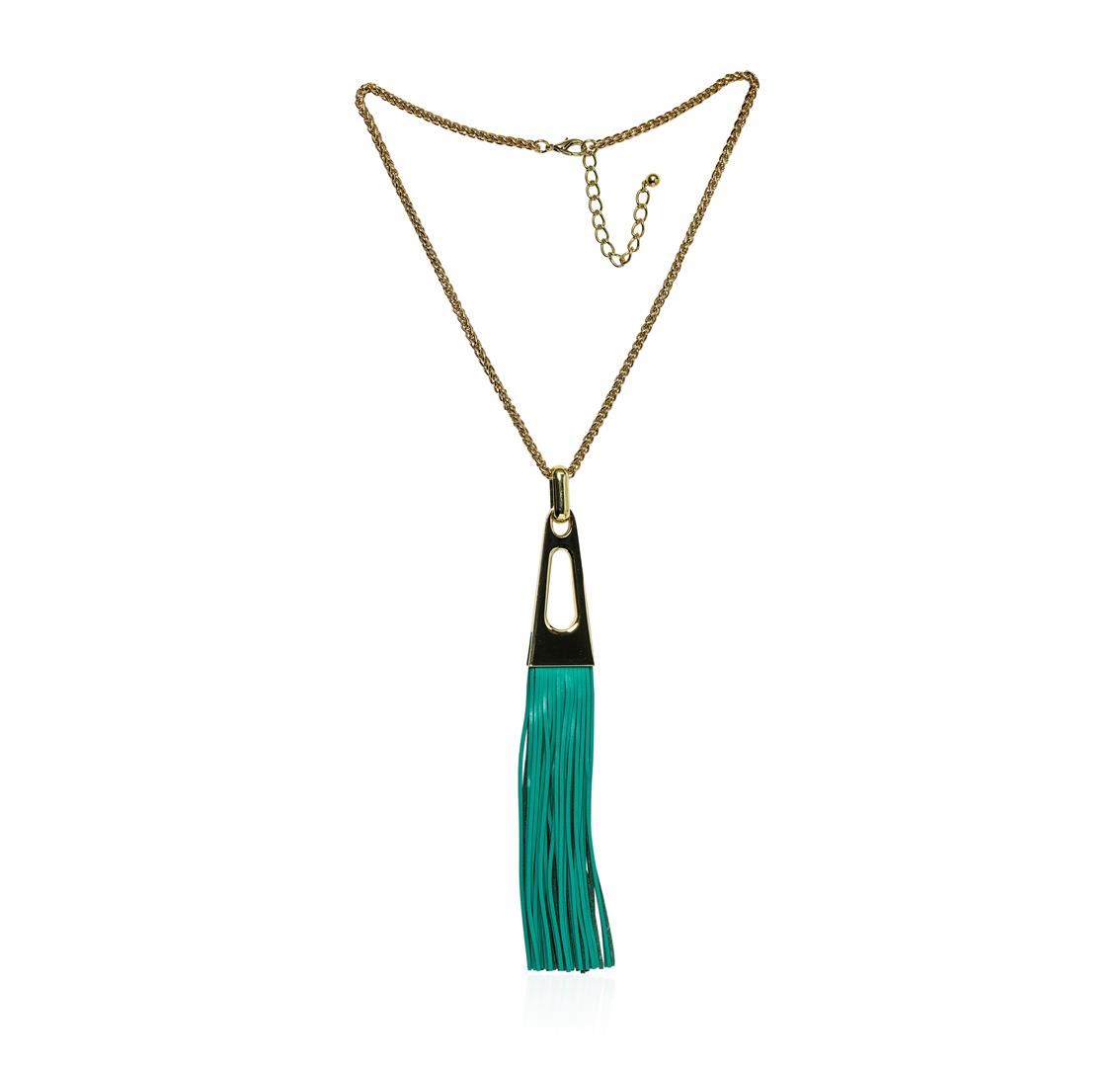 High end designer jewelry. Leather Tassel Chain Necklace - Gold Plated. Gold Plated Metal/3" Ext Clasp. Aqua/ Gold. 22/8inches. Total Weight: 77.7 grams.