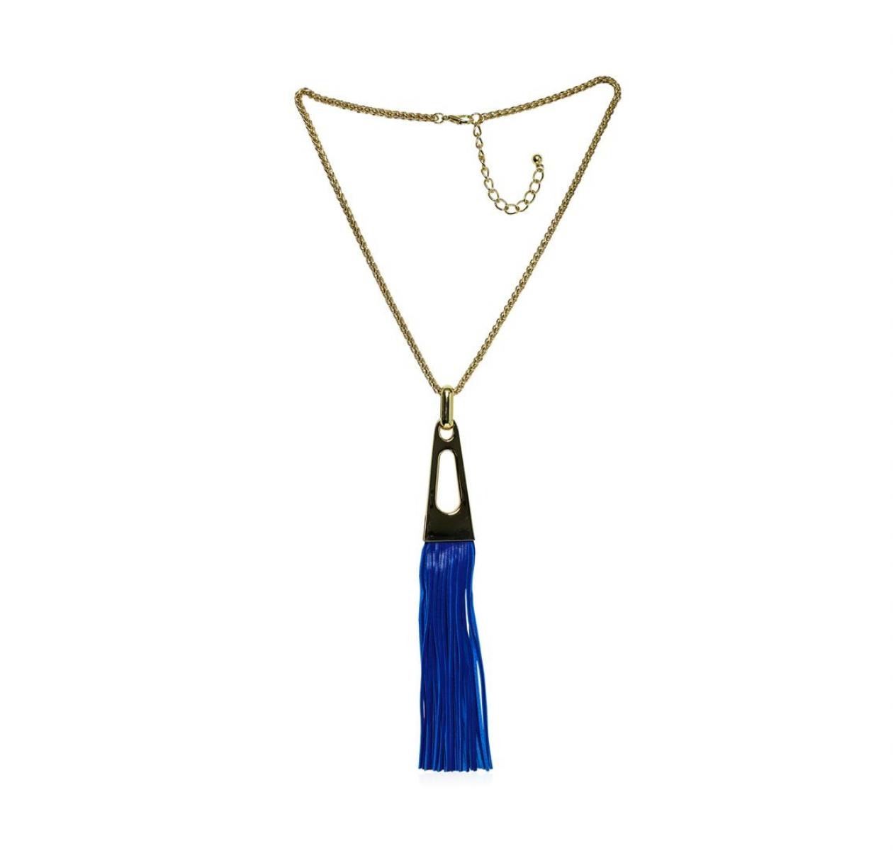 High end designer jewelry. Leather Tassel Chain Necklace - Gold Plated. Gold Plated Metal/3" Ext Clasp. Navy/ Gold. 22/8inches. Total Weight: 76.9 grams.