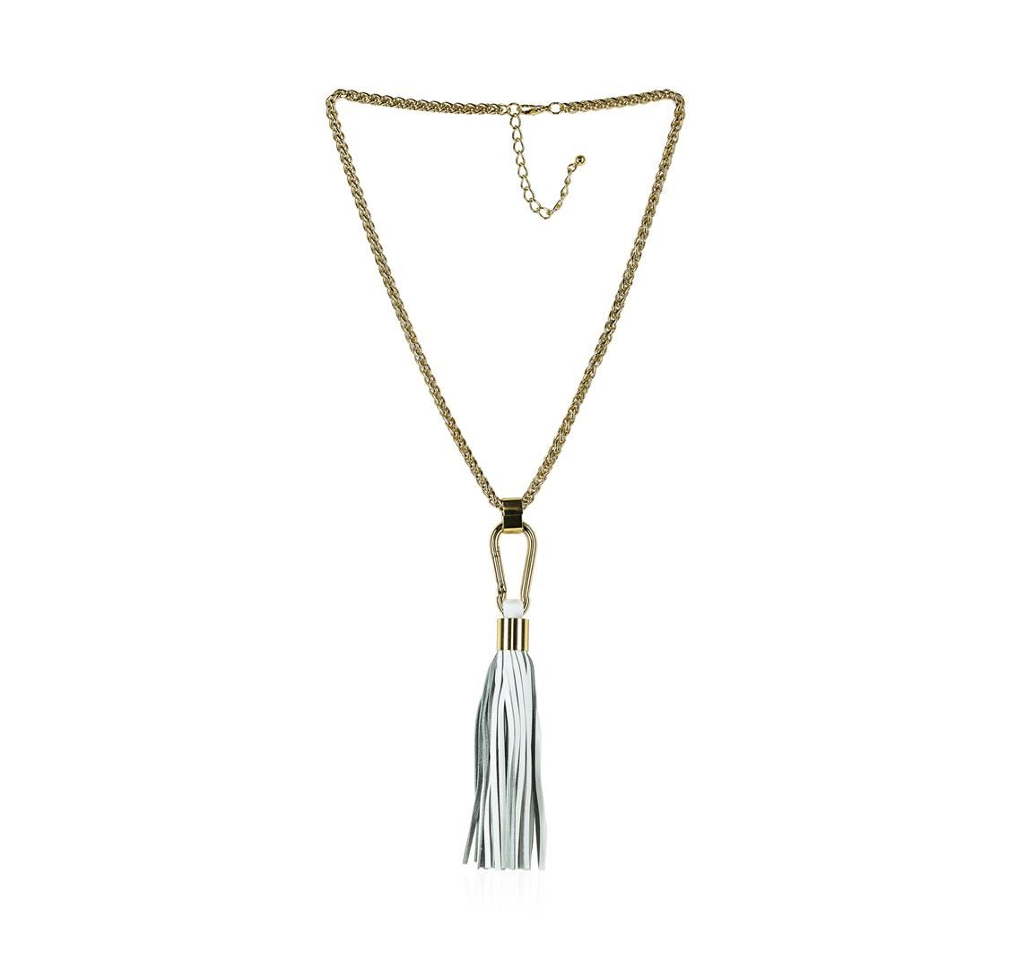 High end designer jewelry. Leather Tassel Hook Pendant Necklace - Gold Plated. Gold Plated Metal/3.5" Ext Clasp. White/gold. 24/7inches. Total Weight: 96.4 grams.
