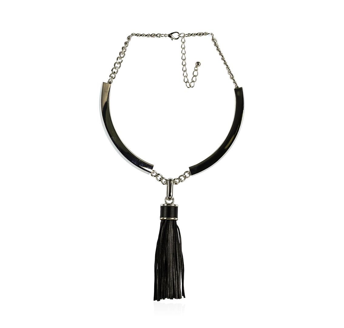 High end designer jewelry. Leather Tassel Pendant Necklace - Rhodium Plated. Rhodium Plated Metal/3.5" Ext Clasp. Black/ Silver. 18/5inches. Total Weight: 149.5 grams.