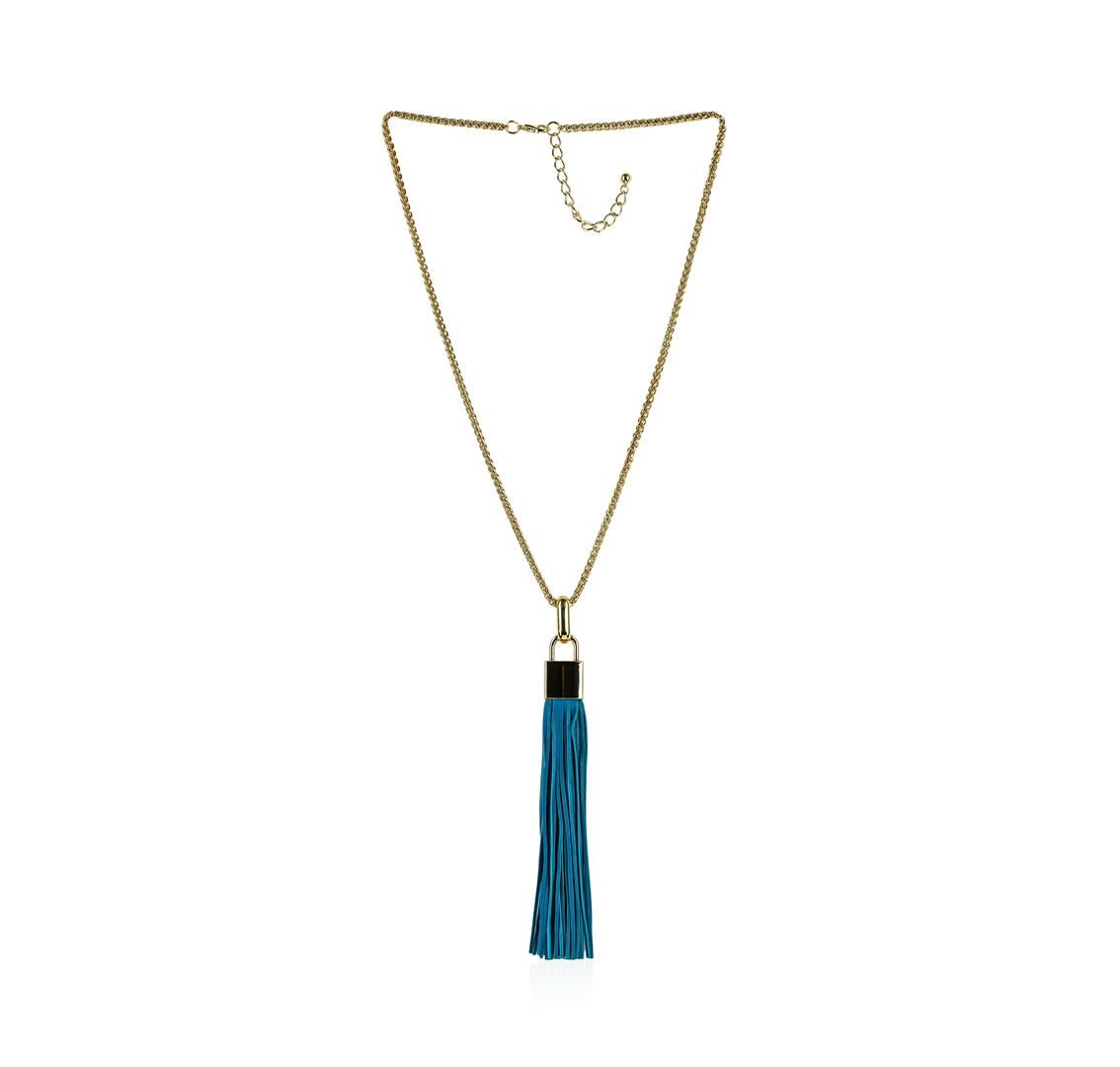 High end designer jewelry. Leather Tassel Square Pendant Chain Necklace - Gold Plated. Gold Plated Metal/3" Ext Clasp. Blue/ Gold. 28/6inches. Total Weight: 66.6 grams.