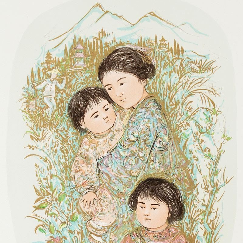 Leaving the Garden by Hibel (1917-2014). Wild lines and muted colors make Edna Hibel's art stand out in any room. "Leaving the Garden" is a limited edition lithograph on paper, numbered and hand signed by Hibel. Includes Certificate of Authenticity! Measures approx. 18" x 22" (with border), 11" x 15" (image).