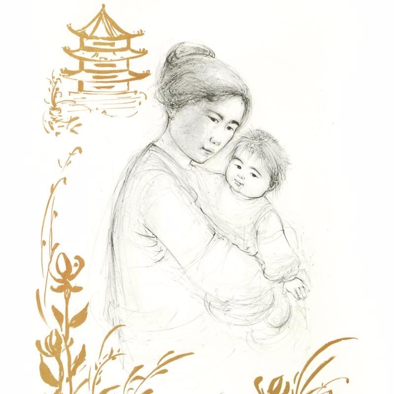 "Lei Jeigiong and her Baby in the Garden of Yun-Tai" is a limited edition lithograph on paper, numbered and hand signed by Edna Hibel (1917-2014). Includes Certificate of Authenticity! Measures approx. 20" x 26" (with border), 14" x 19" (image).