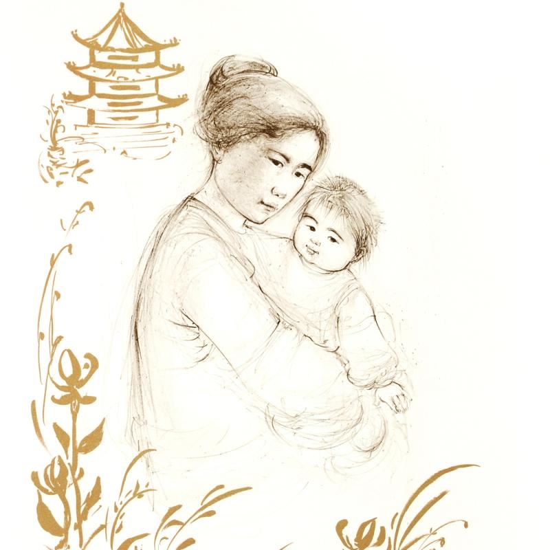 "Lei Jeigiong and her Baby in the Garden of Yun-Tai" is a limited edition lithograph on paper, numbered and hand signed by Edna Hibel (1917-2014). Includes Certificate of Authenticity! Measures approx. 20" x 26" (with border), 14" x 19" (image).