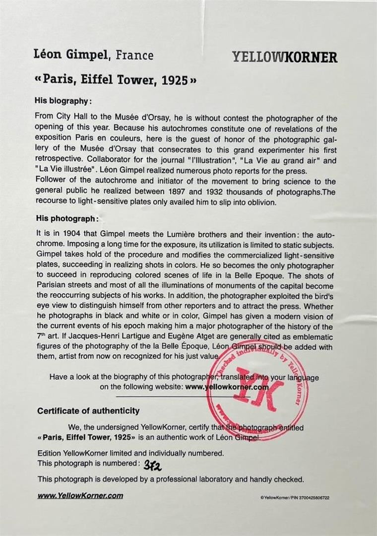 Leon Gimpel France Paris Eiffel Tower 1925 YellowKorner Certified Photograph. Certificate of Authenticity from YellowKorner affixed to the back. Matted Dimensions 16"x20". Protected with Clear Mylar Sleeve.