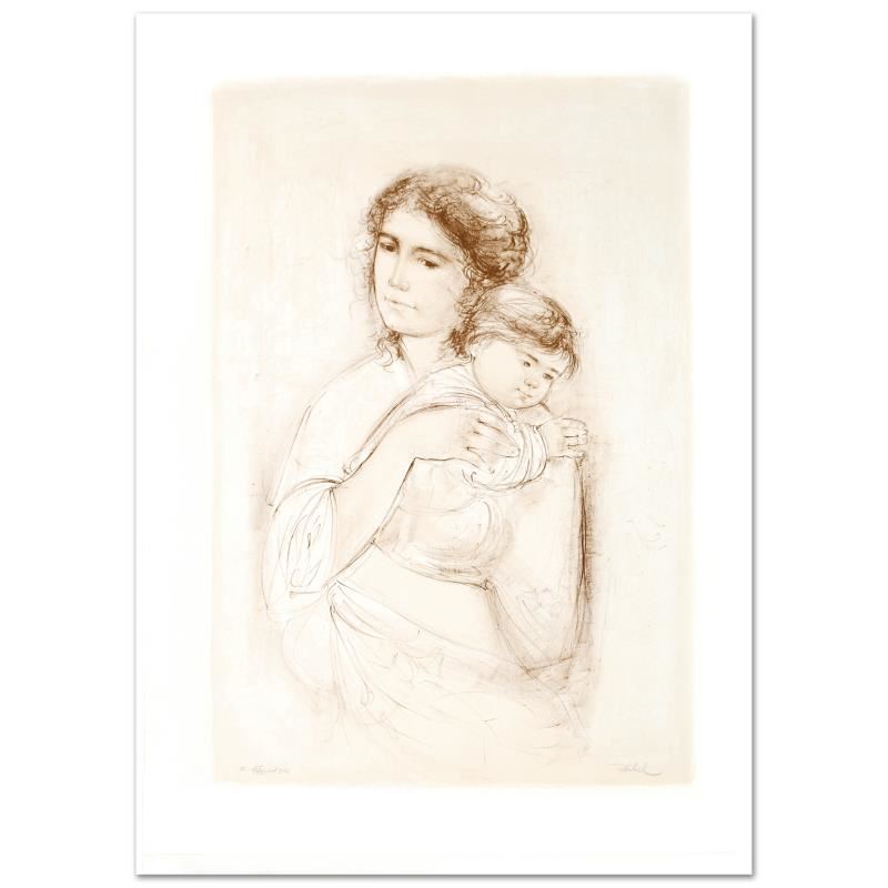 "Leona and Baby" is a limited edition lithograph on paper, numbered and hand signed by Edna Hibel. Includes Certificate of Authenticity! Measures approx. 25" x 35.5" (with border), 19" x 29" (image).