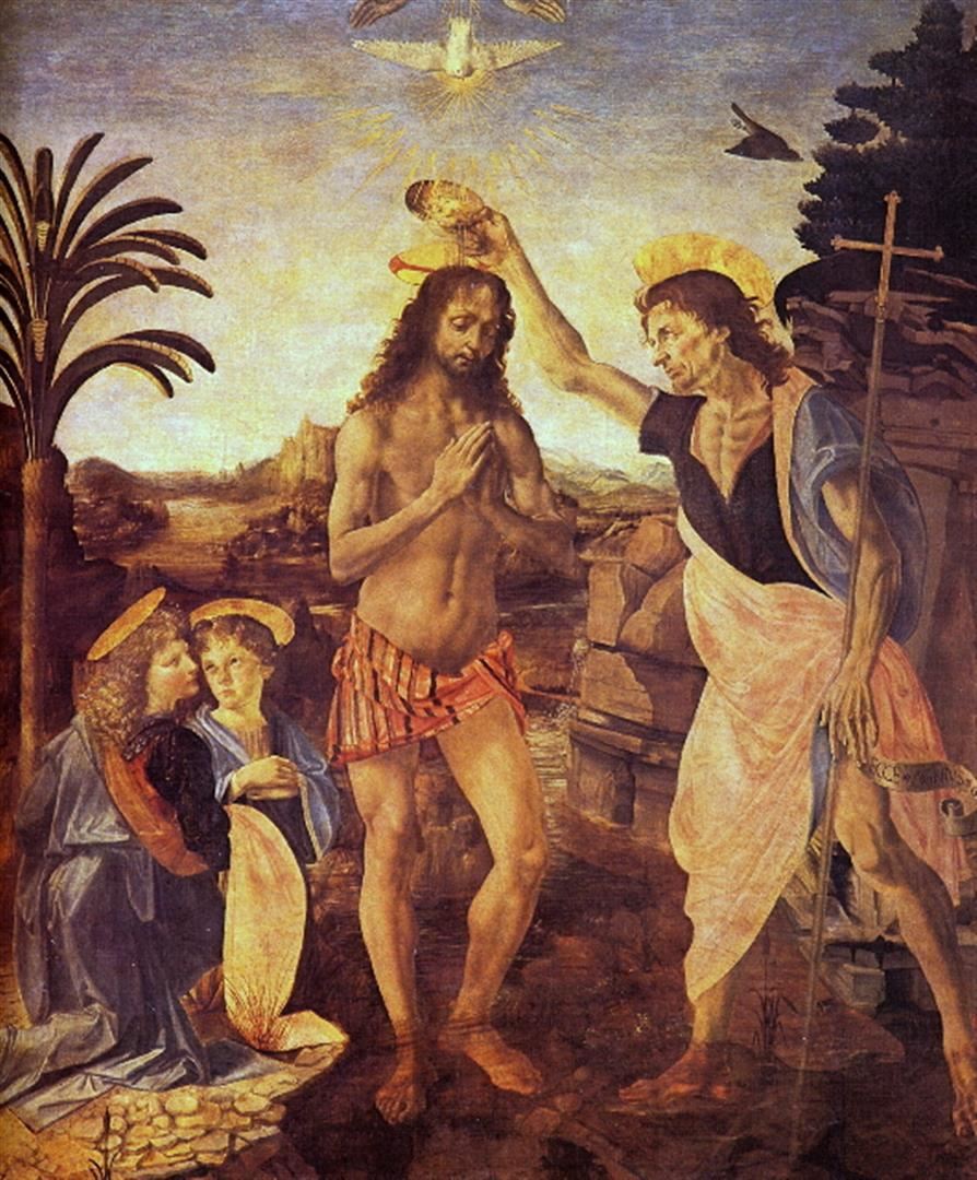 Artist: Leonardo da Vinci - Title: Christs Baptism - Medium: Fine Art Giclee on Canvas - Image Size: Approximately 32 inches x 27 inches - Unframed on Unstretched Canvas - Biography: Leonardo da Vinci (15 April 1452 - 2 May 1519) was an Italian polymath of the High Renaissance who was active as a painter, draughtsman, engineer, scientist, theorist, sculptor and architect. While his fame initially rested on his achievements as a painter, he also became known for his notebooks, in which he made drawings and notes on a variety of subjects, including anatomy, astronomy, botany, cartography, painting, and paleontology. Leonardo's genius epitomized the Renaissance humanist ideal, and his collective works compose a contribution to later generations of artists matched only by that of his younger contemporary, Michelangelo