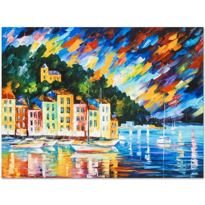 Leonid Afremov's (1955-2019) masterful use of color and texture make his paintings unique collectibles that are sure to brighten any wall. "Portofino Harbor - Italy" is a limited edition giclee on canvas. The piece is numbered and bears the artist's authorized signature. This piece comes gallery wrapped. Includes Letter of Authenticity. Measures approx. 24" x 18" (image).