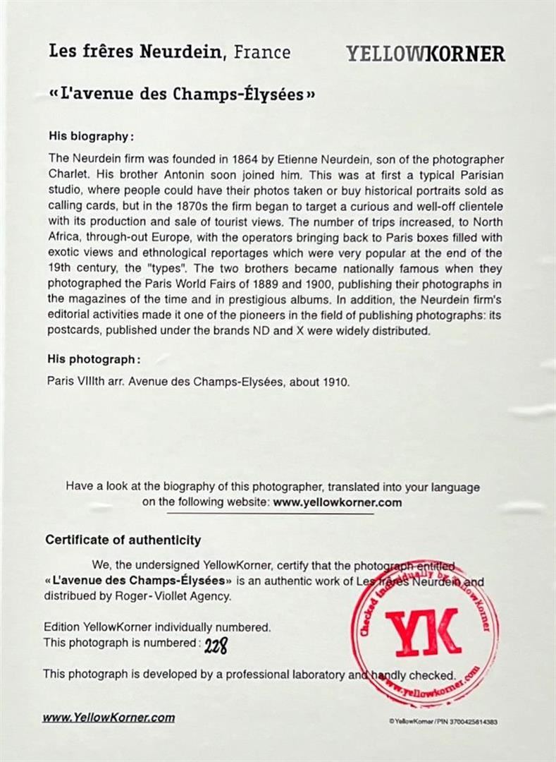 Les Freres Neurdein France L'Avenue des Champs Elysees YellowKorner Certified Photograph. Certificate of Authenticity from YellowKorner affixed to the back. Matted Dimensions 16"x20". Protected with Clear Mylar Sleeve.