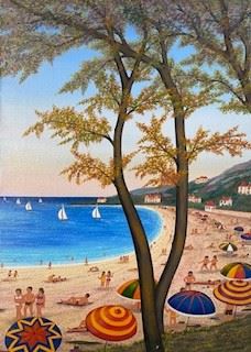 A charming beach scene in a 15x22" acrylic original on canvas by reknown French artist Fanch Ledan; with COA,