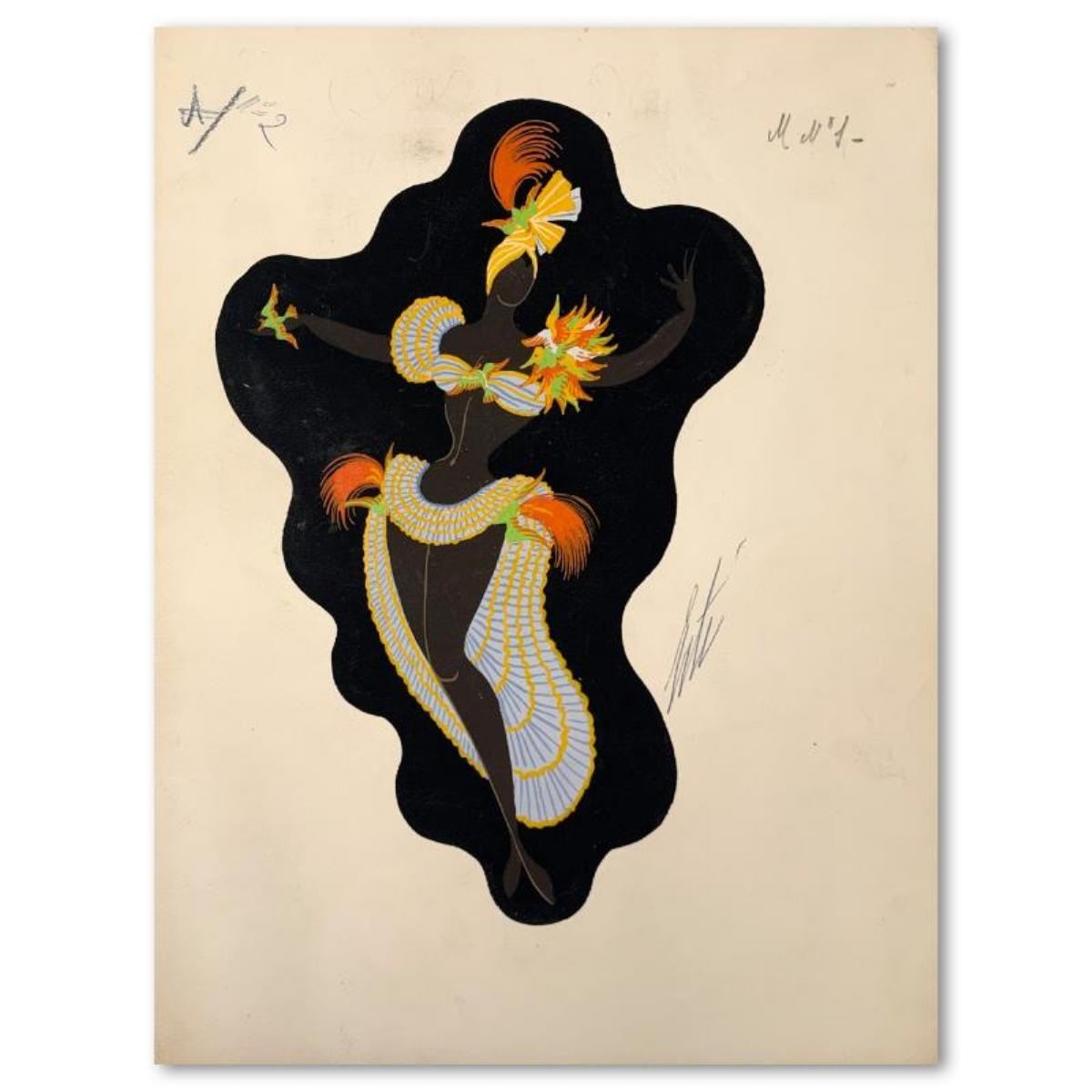Les poules de luxe by Erte (1892-1990). "Les poules de luxe" is an original gauche painting on paper by Erte (1892-1990), hand signed by the artist. This piece bears the stamp, title and registration number 15.348 inverso. Includes Letter of Authenticity. Measures approx. 10.5" x 14.5".