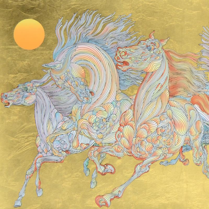 "Lever De Soleil (Black)" is a limited edition serigraph on paper with hand laid gold leaf by Guillaume Azoulay, numbered and hand signed by the artist. Includes Certificate of Authenticity! Measures approx. 38" x 27.5" (border)., 32" x 21" (image).